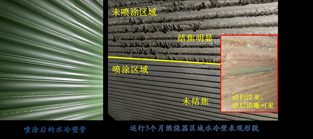 噴涂防護材料的受熱面就像穿了一件“鋼鐵鎧甲”,阻隔了外部腐蝕介質(zhì)的侵入,減少了鍋爐高溫煙氣中熔融物對管壁的黏附,保護水冷管壁表面不受結(jié)焦、高溫腐蝕的影響;并且涂層與基材具有匹配的導(dǎo)熱率和熱膨脹系數(shù),不影響鍋爐的傳熱效率以及使用壽命。同時,防護材料還具有的紅外輻射功效,可強化爐膛內(nèi)輻射傳熱,降低爐膛出口煙溫;強化燃燒,提高煤粉的燃盡率,降低煤耗、提高煤種的適應(yīng)性。
