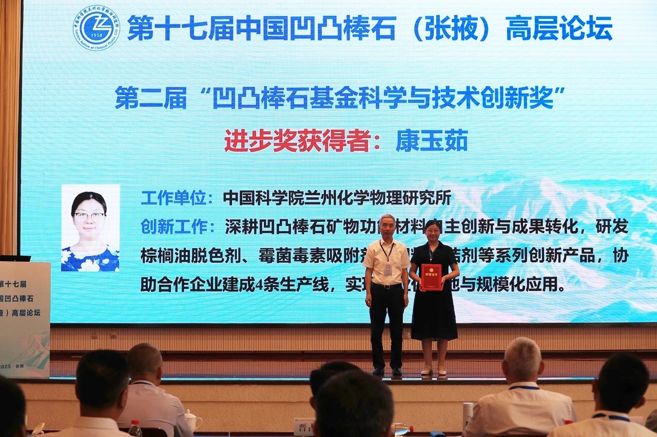 開幕式上,頒發(fā)了第二屆凹凸棒石基金科學(xué)與技術(shù)創(chuàng)新獎,以激勵更多優(yōu)秀人才加入凹凸棒石研究隊伍。蘭州化物所康玉茹高級工程師榮獲進步獎,河北工業(yè)大學(xué)田光燕副教授、淮陰師范學(xué)院毛恒洋副教授和盱眙縣凹土應(yīng)用技術(shù)研發(fā)與成果轉(zhuǎn)化中心臧垚工程師獲得創(chuàng)新獎。
