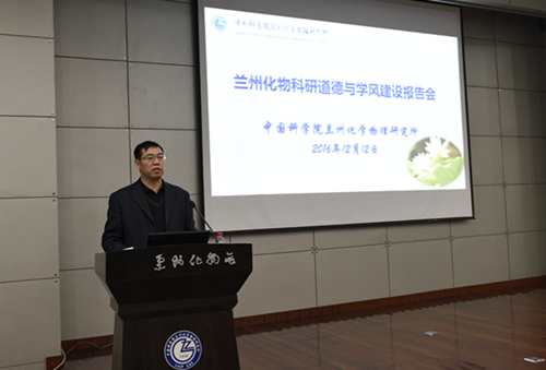 12月12日上午,中國科學(xué)院院士、中國科學(xué)院蘭州化學(xué)物理研究所學(xué)術(shù)委員會副主任、學(xué)位委員會主席劉維民研究員應(yīng)邀為蘭州化物所全所青年職工和研究生作了題為《科學(xué)研究與技術(shù)創(chuàng)新——學(xué)習(xí)、交流與踐行》的專題報告。報告會由蘭州化物所副所長、所科研道德與學(xué)風(fēng)建設(shè)委員會副主任師彥平主持。所紀委書記、副所長、科研道德與學(xué)風(fēng)建設(shè)委員會辦公室主任張長春,研究生導(dǎo)師和全所青年職工、研究生等近300人參加了報告會。