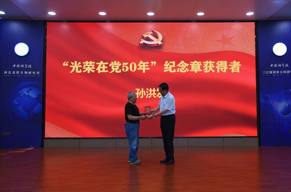 會議第二階段,在雄壯的國歌聲中,西北高原所召開慶祝建黨103周年表彰大會。楊勇剛宣讀了《中共中國科學(xué)院西北高原生物研究所委員會關(guān)于表彰先進黨支部、優(yōu)秀共產(chǎn)黨員和優(yōu)秀黨務(wù)工作者的決定》。首先,所長陳世龍向?qū)O洪發(fā)同志頒發(fā)“光榮在黨50年”紀念章,代表所黨委向?qū)O洪發(fā)同志表示祝賀,并對他多年來為黨的事業(yè)盡心竭力、無私奉獻致以崇高的敬意。