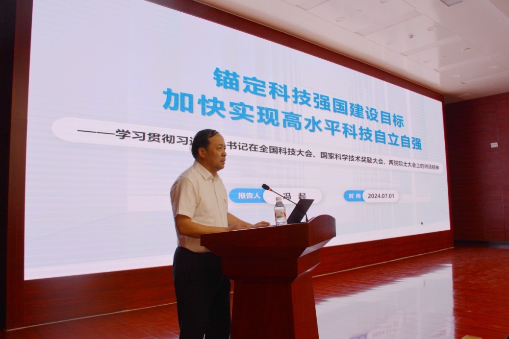 院長馮起傳達學習了習近平總書記重要講話精神和全國科技大會精神,作了《錨定科技強國建設目標 加快實現(xiàn)高水平科技自立自強》專題報告。他強調(diào),全體黨員干部要牢記國家戰(zhàn)略科技力量職責定位,面向國家重大戰(zhàn)略需求和科技前沿,持續(xù)凝練并推動重大科技任務攻關,自覺把科研追求融入建設科技強國的偉大事業(yè)中,將學習成果轉(zhuǎn)化為建設科技強國的強大動力和生動實踐,推動各項工作不斷取得新的更大的成績。