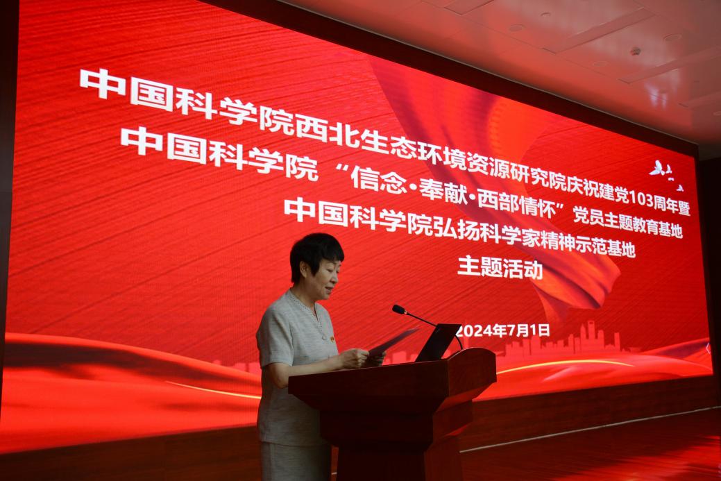 為慶祝中國共產(chǎn)黨成立103周年,7月1日,中國科學院西北生態(tài)環(huán)境資源研究院舉行中國科學院“信念·奉獻·西部情懷”黨員主題教育基地、中國科學院弘揚科學家精神示范基地主題活動。西北研究院黨委委員、領導班子成員、紀委委員、院務委員,黨支部書記、支部委員,研究室(中心)、實驗室、野外臺站和管理部門黨員負責人,黨員代表等參加活動。黨委副書記、紀委書記王萍主持活動。