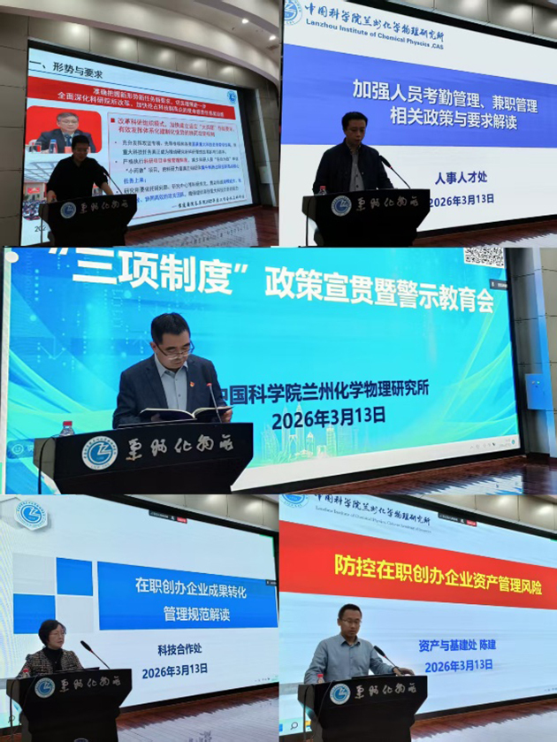 為進(jìn)一步加強(qiáng)科研項目申報管理、人員兼職管理和崗位管理等“三項制度”的執(zhí)行和有效監(jiān)管,3月13日,中國科學(xué)院蘭州化學(xué)物理研究所舉辦“三項制度”政策宣貫暨警示教育會。