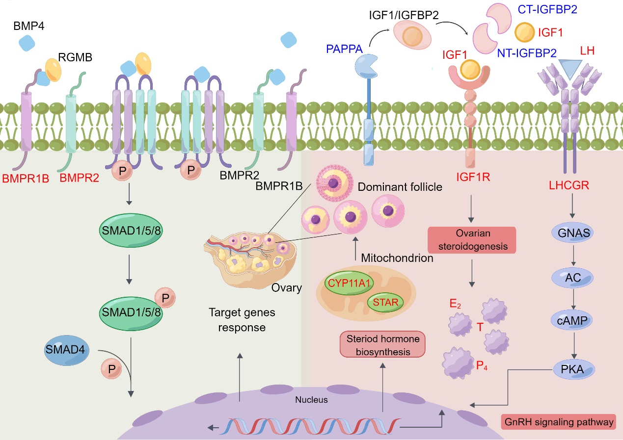 中國科學(xué)院西北高原生物研究所動物生態(tài)與資源保護研究團隊針對綿羊重要繁殖性狀(產(chǎn)羔數(shù)和產(chǎn)羔間隔),以連續(xù)三個產(chǎn)羔季節(jié)產(chǎn)多胎(每胎產(chǎn)兩羔或三羔,HF)和產(chǎn)單胎(每胎產(chǎn)一羔,LF)的藏羊為研究對象,整合全基因組關(guān)聯(lián)分析、普通轉(zhuǎn)錄組學(xué)、單細胞轉(zhuǎn)錄組學(xué)、蛋白質(zhì)組學(xué)和代謝組學(xué)等多組學(xué)研究方法,結(jié)合KASP基因分型、實時熒光定量PCR、酶聯(lián)免疫吸附實驗、免疫共沉淀和蛋白質(zhì)免疫印跡等分子功能驗證實驗,挖掘藏羊產(chǎn)羔數(shù)和產(chǎn)羔間隔關(guān)鍵調(diào)控元件并揭示其高繁殖力的遺傳調(diào)控機制。全基因組關(guān)聯(lián)研究表明,BMPR1B基因與產(chǎn)羔數(shù)性狀相關(guān),PAPPA基因與產(chǎn)羔間隔性狀相關(guān)。首次構(gòu)建了藏羊卵巢單細胞圖譜,發(fā)現(xiàn)關(guān)鍵基因PAPPA特異性表達在壁層顆粒細胞亞群,且BMPR1B基因在壁層顆粒細胞和固醇生成顆粒亞群高表達?;趩渭毎D(zhuǎn)錄組學(xué)、蛋白質(zhì)組學(xué)和代謝組學(xué)整合分析,發(fā)現(xiàn)PAPPA是刺激卵巢優(yōu)勢卵泡生長發(fā)育和類固醇生成的關(guān)鍵候選基因。繁殖主效基因BMPR1B除了非同義突變,首次在藏羊中發(fā)現(xiàn)BMPR1B還存在可變剪接事件調(diào)控多胎性狀。該研究結(jié)果對分子精準選育提升藏羊繁殖力和實現(xiàn)藏羊產(chǎn)業(yè)提質(zhì)增效具有重要意義。