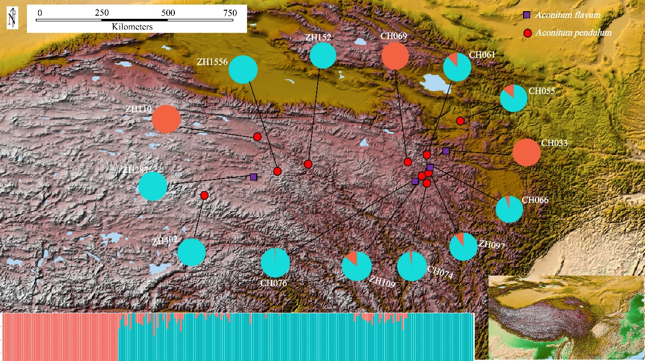 鐵棒錘(Aconitum pendulum Busch)和伏毛鐵棒錘(Aconitum flavum Hand.-Mazz.)為烏頭屬(Aconitum L.)多年生的草本植物,主要分布在青藏高原及其毗鄰地區(qū)。二者具有高度相似的形態(tài)特征,是研究青藏高原區(qū)域物種形成和演化歷史的理想材料。中國科學(xué)院西北高原生物研青藏高原植物適應(yīng)與進(jìn)化研究團(tuán)隊(duì)利用基因分型測序(Genotyping-by-sequencing,GBS)獲取全基因組單核苷酸多態(tài)性(Single Nucleotide Polymorphism,SNP),以探究二者的物種界限和遺傳多樣性。結(jié)果發(fā)現(xiàn)鐵棒錘和伏毛鐵棒錘均非單系,種間遺傳差異小于居群間遺傳差異,且具有高度重疊的生態(tài)位,因此建議將二者合并為一個(gè)物種?;蛄骱瓦z傳漂變可能是導(dǎo)致居群遺傳結(jié)構(gòu)不明顯的主要原因。末次盛冰期的氣候波動(dòng)縮小影響了居群數(shù)量,人類活動(dòng)和生境破碎化進(jìn)一步使居群數(shù)量減少。