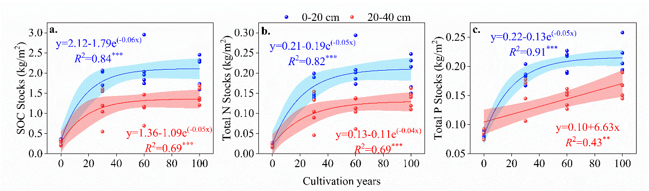 中國科學院西北生態(tài)環(huán)境資源研究院科研團隊對張掖綠洲區(qū)不同開墾年限農田土壤的碳儲量和養(yǎng)分儲量進行了探究,通過回歸分析揭示了碳庫和養(yǎng)分庫隨常規(guī)耕作年限的變化模式,并結合隨機森林模型等分析了影響碳庫和養(yǎng)分庫的關鍵因子。研究發(fā)現(xiàn),沙漠開墾后0-40 cm土壤碳庫擴大了4.2倍,氮儲量和磷儲量增加了1.2-6.5倍。然而,回歸分析表明碳儲量和養(yǎng)分儲量均隨耕作年限的增加呈指數(shù)變化模式,在常規(guī)耕作60年后,0-40 cm土層的碳庫和氮儲量及表層土壤中的磷儲量停止增長。土壤化學計量、pH和機械組成是影響綠洲農田土壤碳庫和養(yǎng)分庫的關鍵因素。研究表明,雖然沙漠開墾后土壤質量得到了顯著改善,但長期的常規(guī)管理措施限制了改良效應,因此,干旱區(qū)綠洲農田的常規(guī)管理措施中應適當引入保護性耕作措施,以實現(xiàn)農田土壤的可持續(xù)生產。