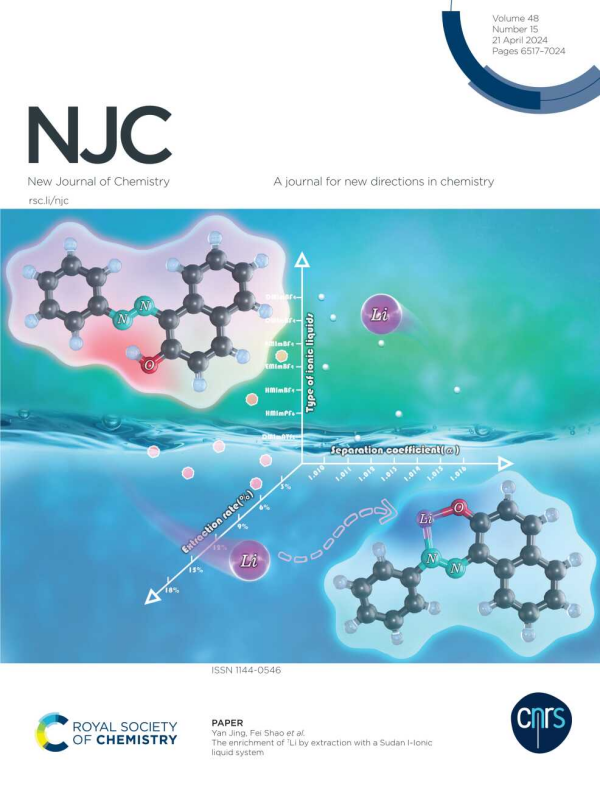中國科學院青海鹽湖研究所同位素分離與化學品精制課題組針對蘇丹Ⅰ(1-苯基偶氮-2-萘酚)萃取富集7Li分離效應低問題開展研究。基于離子液體在鋰同位素分離體系中表現(xiàn)出優(yōu)異的協(xié)萃性能,將離子液體引入蘇丹Ⅰ體系中,構建蘇丹離子液體(Ⅰ-[HMIm][BF4])萃取體系,極大提高了蘇丹Ⅰ對7Li的分離能力。蘇丹Ⅰ與Li+是1:1進行絡合,過程中離子液體在跨界面遷移中主要起輔助作用,離子液體陰離子親水性越強,其輔助萃取作用越強,且計算表明離子液體的陰離子極有可能參與了蘇丹Ⅰ與鋰離子的配位。此研究成果在New Journal of Chemistry期刊發(fā)表封面學術論文一篇,SCI收錄。