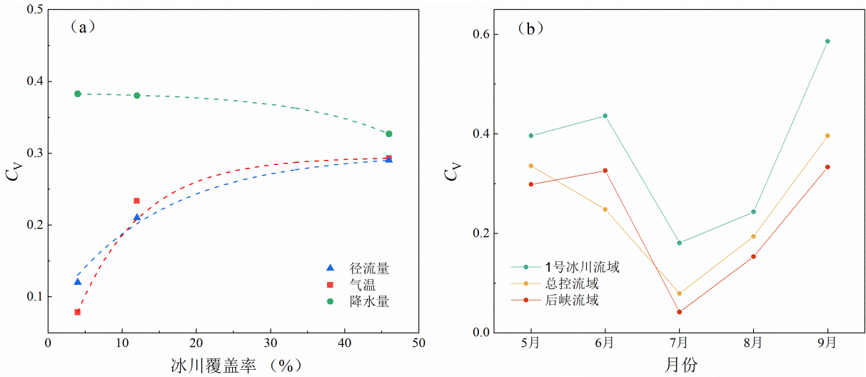 (3)三個子流域融冰徑流和冰川徑流的貢獻率與冰川覆蓋率呈線性關(guān)系,與前人在阿爾卑斯山38個冰川覆蓋流域研究得到的對數(shù)關(guān)系有所不同,主要是烏河流域冰川在夏季強烈消融所致(圖3)。三個子流域的徑流變差系數(shù)(CV)分別為0.29、0.21和0.12,隨著冰川覆蓋率的降低而減小,這主要與流域徑流組成、下墊面特征等因素有關(guān)(圖4)。