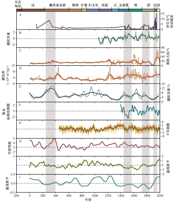 圖2? 敦煌歷史時(shí)期沙塵天氣活動(dòng)強(qiáng)度序列(A),敦德冰芯微粒含量(B),蘇干湖沉積物粗粒含量(C),蘇干湖沉積物磁化率(D),巴里坤湖沉積物組分含量(E),河西走廊近600年降水序列(F),河西走廊帕爾默干旱度指數(shù)(scPDSI)序列(G),黑河流域近2 000年旱澇序列(H),Yang等重建的中國(guó)2 000年溫度序列(I),Ge等重建的中國(guó)2 000年溫度序列(J)