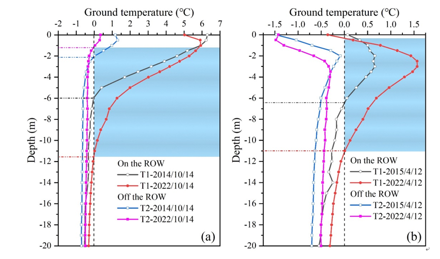研究表明,管周多年凍土迅速退化,距離管道一線2米處的年最大融化深度以每年0.68 m的速度下降,至2022年融化深度已達到11.4m,融區(qū)水平方向約51m。管道一線、二線周圍的融區(qū)在不斷擴張并呈現(xiàn)逐漸貫通的趨勢。凍土融化引起的管道下沉和地表差異性融沉導致了熱融洼地和積水、冰椎的規(guī)律性分布。
