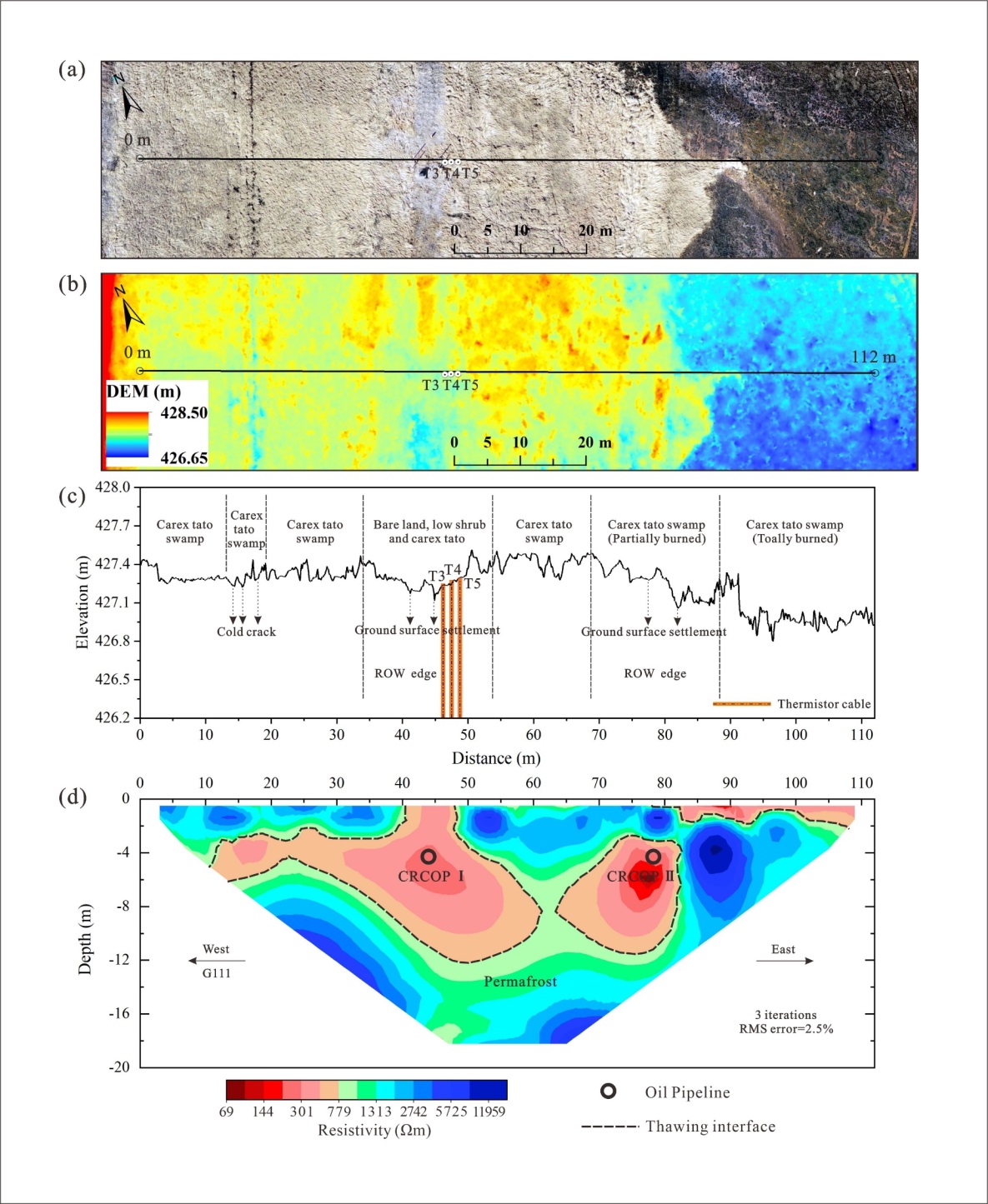 西北研究院科研團隊利用中俄原油管道沿線典型場地的油溫、地溫、管道位移、地表形變、物探(ERT)和無人機影像數(shù)據(jù),分析了管道周圍多年凍土融化、地表變形、植被變化、積水和冰椎分布等,并對多年凍土融化與地表形變之間的協(xié)變性進行了系統(tǒng)研究。