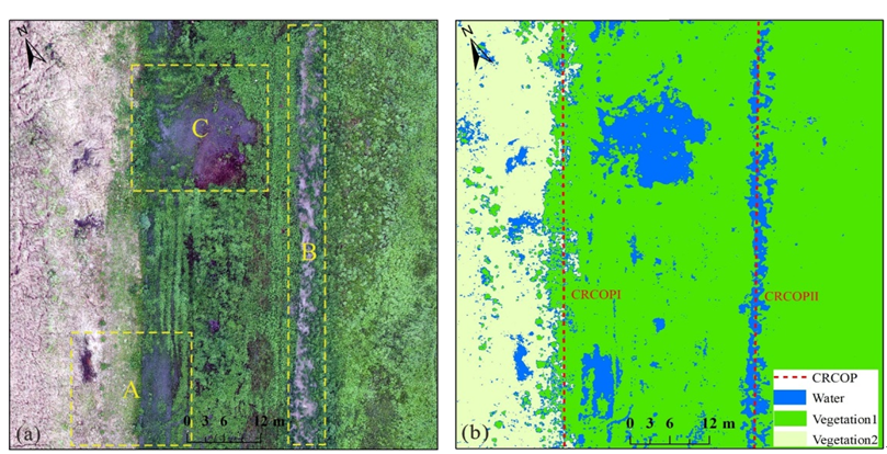 圖3 管道沿線積水分布 (a)無人機正射影像?。╞)影像監(jiān)督分類結果