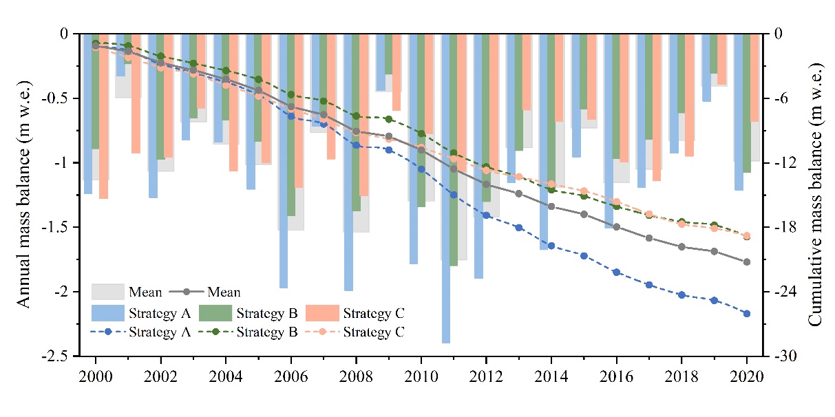 該成果以Historical reconstruction of glacier mass balance and its contribution to water resources in the Sawir Mountains from 2000 to 2020為題發(fā)表于Science of the Total Environment期刊上。碩士研究生余鳳臣為第一作者,王璞玉研究員為通訊作者。該研究獲國家自然科學(xué)基金、中國科學(xué)院青年創(chuàng)新促進(jìn)會優(yōu)秀會員項(xiàng)目、新疆第三次綜合科學(xué)考察項(xiàng)目和冰凍圈科學(xué)國家重點(diǎn)實(shí)驗(yàn)室自主項(xiàng)目等聯(lián)合資助。