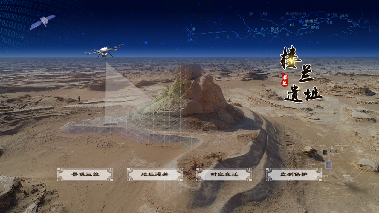 系統(tǒng)平臺通過“景觀三維、遺址漫游、時空變遷、監(jiān)測保護”四個功能模塊,實現(xiàn)了衛(wèi)星宏觀遙感、無人機精細測繪、地面實時監(jiān)測等綜合技術(shù)在樓蘭遺址的協(xié)同應(yīng)用。能夠通過精細二三維實景地圖模型客觀真實、身臨其境地展示遠在千里之外的神秘古城;通過歷史地圖和衛(wèi)星遙感數(shù)據(jù)的空間一體化,提供了一套研究樓蘭古跡時空演變的空間數(shù)據(jù)庫;利用衛(wèi)星、無人機和地面?zhèn)鞲衅骷夹g(shù),實現(xiàn)了“天空地”一體化的樓蘭遺址生態(tài)環(huán)境因子系統(tǒng)監(jiān)測與分析。