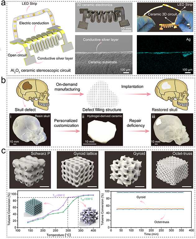 基于此方法,研究人員還可制造無支撐且大跨度的陶瓷三維電路,且這種陶瓷三維電路能很好地點(diǎn)亮LED燈帶。此外,利用水凝膠柔性骨架的可變形性,可按需或個(gè)性化制造具有顱骨缺損形狀的陶瓷結(jié)構(gòu)來實(shí)現(xiàn)骨缺陷部位修復(fù)。制造的陶瓷結(jié)構(gòu)還可結(jié)合表面改性策略創(chuàng)造性設(shè)計(jì)制備高性能的復(fù)雜結(jié)構(gòu)催化陶瓷器件,具有優(yōu)良的催化活性和穩(wěn)定性。研究人員還進(jìn)一步拓展了這種方法在三維電路、生物醫(yī)用及功能催化領(lǐng)域的潛在應(yīng)用(圖3)。