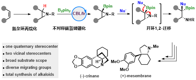 近日,該團隊針對簡單烯烴不對稱多官能團化存在的問題,利用其發(fā)展的CBL/銥催化體系,結(jié)合烯烴的氮雜環(huán)丙烷化/開環(huán)1,2-遷移硼化的組合策略,實現(xiàn)了簡單烯烴的不對稱三官能團化反應(yīng),高對映選擇性地實現(xiàn)了鄰位季碳中心的手性胺。同時,利用該方法,團隊首次實現(xiàn)了從廉價易得的環(huán)己烯到石蒜科生物堿(-)-crinane和(+)-mesembrane的對映選擇性全合成。
