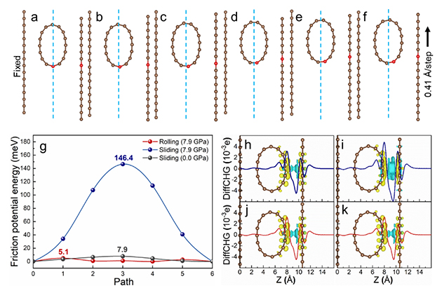 研究團(tuán)隊(duì)發(fā)現(xiàn)石墨納米片在100K以下靜態(tài)低溫條件下會發(fā)生邊緣自卷翹的奇特現(xiàn)象;利用這一效應(yīng),在摩擦過程中剪切力可進(jìn)一步驅(qū)動其在摩擦界面上原位形成納米卷軸結(jié)構(gòu),掃描電鏡圖像顯示這些納米卷軸呈現(xiàn)平行排列,且與滑動方向垂直,證明其發(fā)生了分子滾動潤滑。同時石墨表現(xiàn)出反常的宏觀真空潤滑特性,在50K真空條件下,潤滑狀態(tài)變得平穩(wěn)而長效,摩擦系數(shù)約0.06,磨損率僅為300 K時的1/50。通過密度泛函理論模擬計(jì)算,進(jìn)一步揭示了分子滾動過程界面電荷能量耗散減弱的機(jī)制。該研究為解決傳統(tǒng)石墨類材料真空潤滑性能差和超低溫潤滑領(lǐng)域難題提供了全新解決思路和方案。