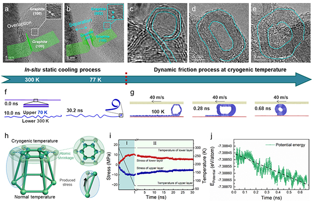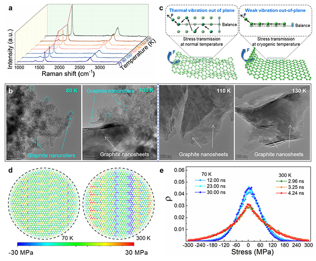 結(jié)合實(shí)驗(yàn)和理論模擬系統(tǒng),研究團(tuán)隊(duì)研究了石墨納米片邊緣自卷翹形變的影響因素、結(jié)構(gòu)演變和形成機(jī)理。結(jié)果表明,超低溫環(huán)境下,非平衡溫度場導(dǎo)致了原子的不均勻收縮,石墨片上下表面產(chǎn)生了方向相反的應(yīng)力,驅(qū)動了石墨片邊緣的自卷翹;同時發(fā)現(xiàn)熱振動對原子間應(yīng)力傳遞的耗散作用,當(dāng)溫度低于100K時,原子熱振動顯著減弱,原子間應(yīng)力傳遞耗散被抑制,促進(jìn)了石墨納米片自卷翹形變的發(fā)生。該研究將為認(rèn)識微觀粒子受力傳遞規(guī)律和納米形變機(jī)理提供新的理解,同時發(fā)現(xiàn)了一種利用溫度操控自卷曲納米形變行為的新方法,在潤滑、傳感等眾多領(lǐng)域具有廣泛應(yīng)用價值。
