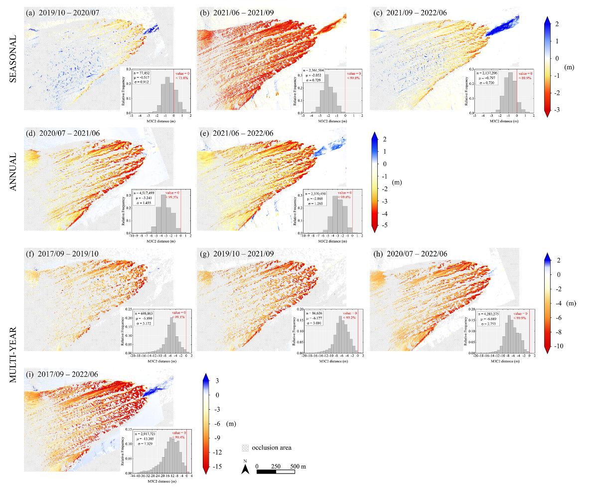 該研究通過運(yùn)用Multiscale Model to Model Cloud Comparison(M3C2)算法,以厘米級精度對崗隴加瑪冰川下游的變化進(jìn)行了全面刻畫。結(jié)合花桿觀測數(shù)據(jù)與降水記錄,研究團(tuán)隊成功重建了該冰川的物質(zhì)平衡序列。