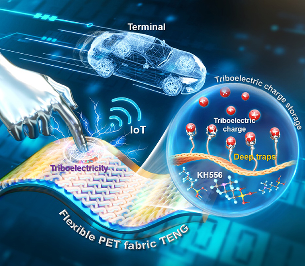 摩擦起電過程中產(chǎn)生的電荷會瞬時存儲在電介質(zhì)表面,進而被兩種不同類型的陷阱(淺陷阱和深陷阱)捕獲。其中,淺陷阱中的電荷容易逸出,優(yōu)先耗散到環(huán)境中,而深陷阱中的電荷則因為極難逸出,可長期儲存。因此,影響摩擦層電荷耗散率的關(guān)鍵因素是陷阱捕獲電荷和被捕獲電荷的逃逸能力?;诖耍搱F隊通過系統(tǒng)研究,揭示了載流子深陷阱在摩擦電荷存儲中的機制,通過分子自組裝技術(shù)在織物摩擦層界面構(gòu)建載流子深陷阱的方式增加TENG的電輸出,將該織物TENG用于物聯(lián)網(wǎng)可穿戴電子設(shè)備的電源模塊,實現(xiàn)了對機械運動的穩(wěn)定控制。相關(guān)研究成果發(fā)表在Advanced Materials(2024,2303389)上。