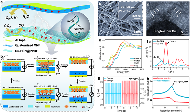 近日,研究團隊與新加坡科學(xué)技術(shù)研究局的科研人員合作,在界面電荷利用方面做出新突破,利用單原子銅錨定的聚合物碳氮化物催化劑和季銨化纖維素納米纖維成功實現(xiàn)了接觸電催化CO2還原,生成CO的法拉第效率達到96.24?。?/span>。季銨化纖維素納米纖維由于含豐富的羥基,可在高濕度環(huán)境中與水分子形成氫鍵,固定水分子并參與接觸帶電并發(fā)生氧化反應(yīng),導(dǎo)致氧氣和質(zhì)子的產(chǎn)生,參與觸電催化CO2還原過程。這種方法在低濃度CO2環(huán)境中能高效地將其轉(zhuǎn)化為CO,為減少大氣CO2排放和推進化學(xué)可持續(xù)性策略提供了一種解決方案。