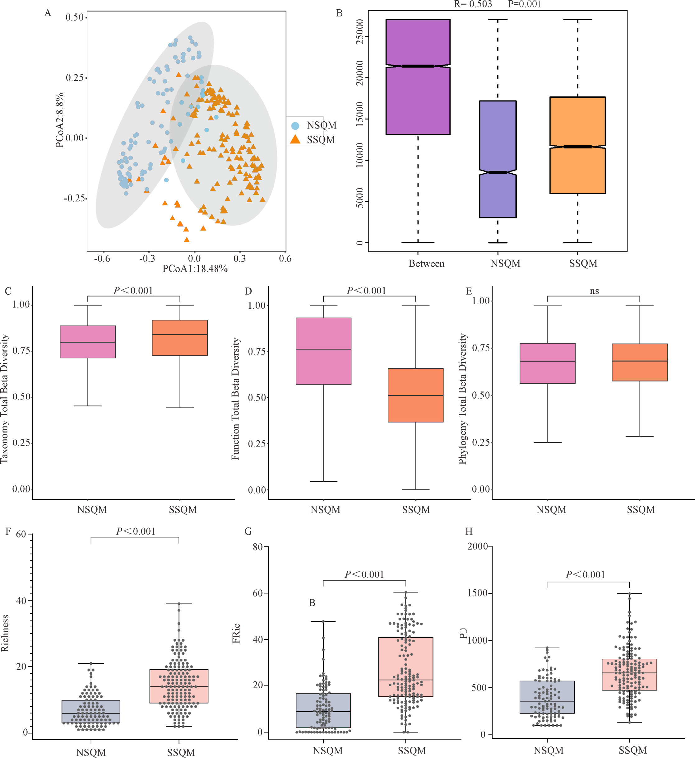 祁連山南北坡鳥類群落多樣性格局。(A) NSQM和SSQM中鳥類β多樣性的主坐標(biāo)分析(PCoA);(B) NSQM和SSQM中鳥類群落的相似性(ANOSIM);(C, D, E) NSQM和SSQM中鳥類群落分類, 功能, 系統(tǒng)發(fā)育總β多樣性;(F, G, H) NSQM和SSQM中鳥類群落Richness指數(shù), FRic和PD指數(shù)