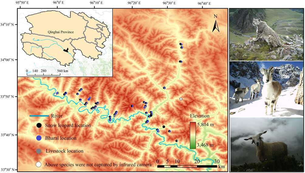 中國科學院西北高原生物研究所動物生態(tài)與資源保護研究團隊以人獸沖突較為嚴重的曲麻萊縣巴干鄉(xiāng)為研究地區(qū),利用調查問卷評估了當?shù)啬撩駥ρ┍u擊家畜事件的態(tài)度,并結合紅外相機陷阱技術獲得了雪豹和其主要獵物巖羊(Pseudois nayaur)以及散養(yǎng)家畜的影像資料,進而探討了三種(類)動物的時空重疊。研究結果表明:?。?)雪豹主要在夜間捕食家畜,牧民因雪豹襲擊家畜事件的發(fā)生而對雪豹保護持消極態(tài)度;(2)巖羊和家畜的空間利用重疊度最高(OI?。健?.78),其次是雪豹和巖羊(OI?。健?.75)以及雪豹和家畜(OI?。健?.75);(3)雪豹屬于典型的夜行性動物,而巖羊和家畜以晝間活動為主。巖羊和家畜的日活動節(jié)律模式高度一致,時間重疊指數(shù)最高(D?。健?.95),而雪豹和巖羊、雪豹和家畜的日活動節(jié)律重疊指數(shù)較低(D = 0.51),且重疊時段主要集中于夜間。綜上所述,由于雪豹、巖羊和散養(yǎng)家畜之間存在較高的空間重疊,可能增加了家畜被雪豹捕食的機會,同時,家畜和巖羊活動節(jié)律的高度重疊進一步加劇了此類事件的發(fā)生幾率。基于研究結果,我們提出了針對性的保護和管理措施,例如規(guī)范放牧區(qū)域以減小家畜與雪豹的相遇幾率,加強對散養(yǎng)家畜的夜間管理以減少雪豹夜間肇事等。