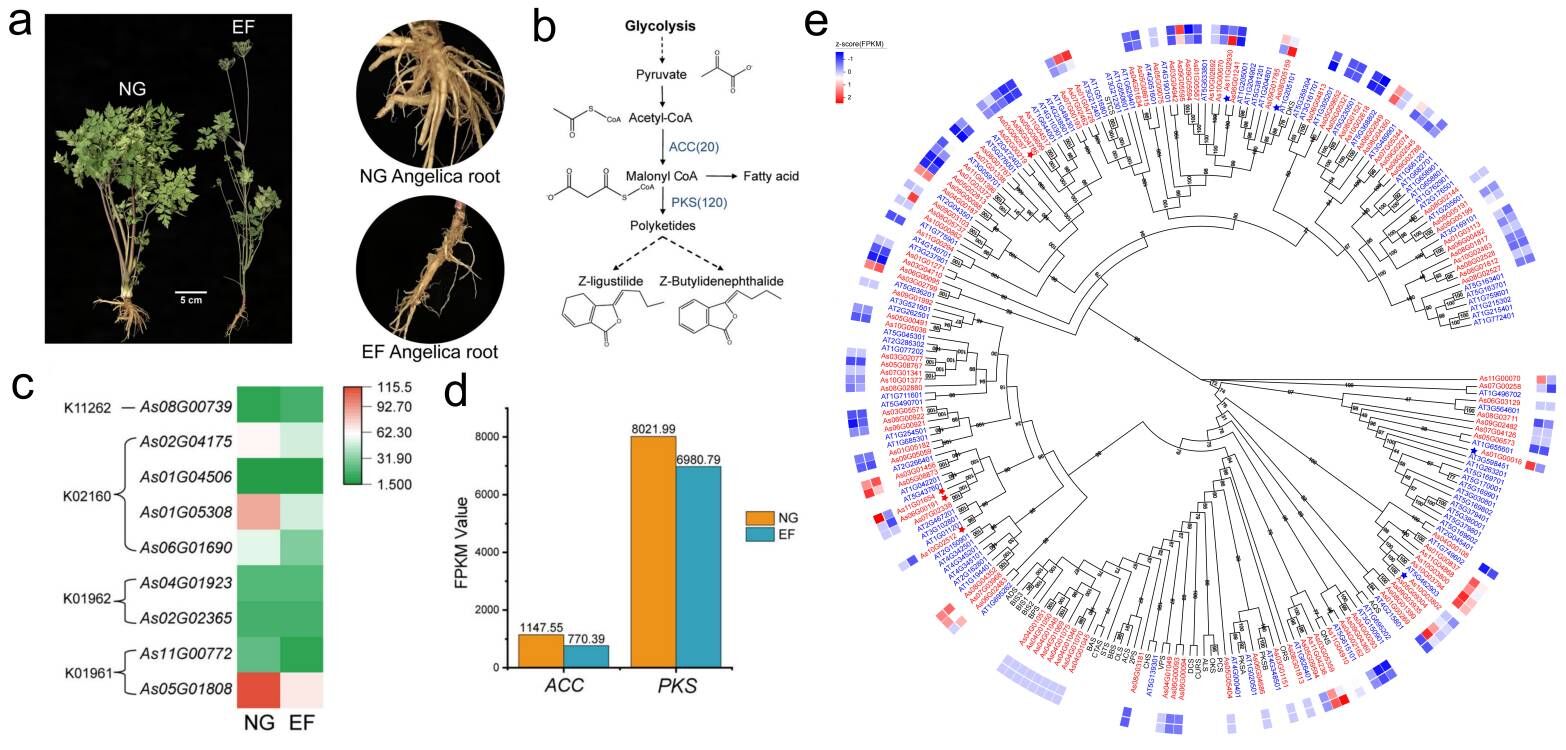 圖 苯酞類(lèi)物質(zhì)的合成與調(diào)控 a.正常生長(zhǎng)當(dāng)歸(NG)和早花當(dāng)歸(EF) b.丙二酰輔酶A的合成代謝途徑 c.正常當(dāng)歸和早花當(dāng)歸根中ACC基因的表達(dá)量熱圖 d. 正常當(dāng)歸和早花當(dāng)歸根中ACC基因和PKS基因的表達(dá)量值(FPKM)e.當(dāng)歸中PKS基因的進(jìn)化樹(shù),及其在正常當(dāng)歸和早花當(dāng)歸中根的表達(dá)量熱圖。