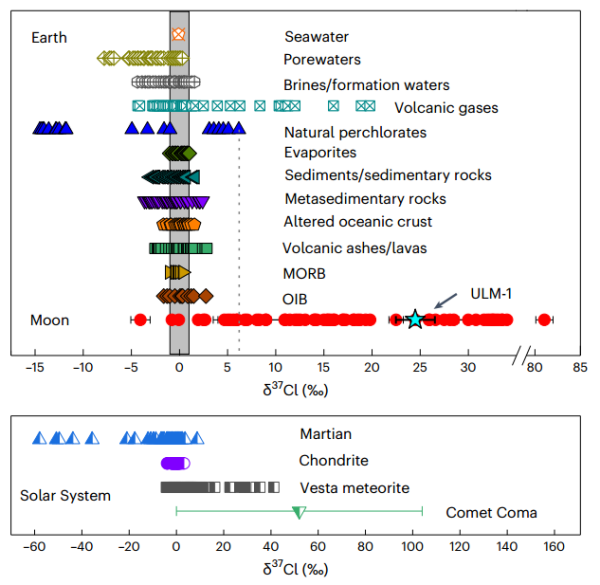 不同陸地和地外儲(chǔ)庫中氯同位素組成的成分