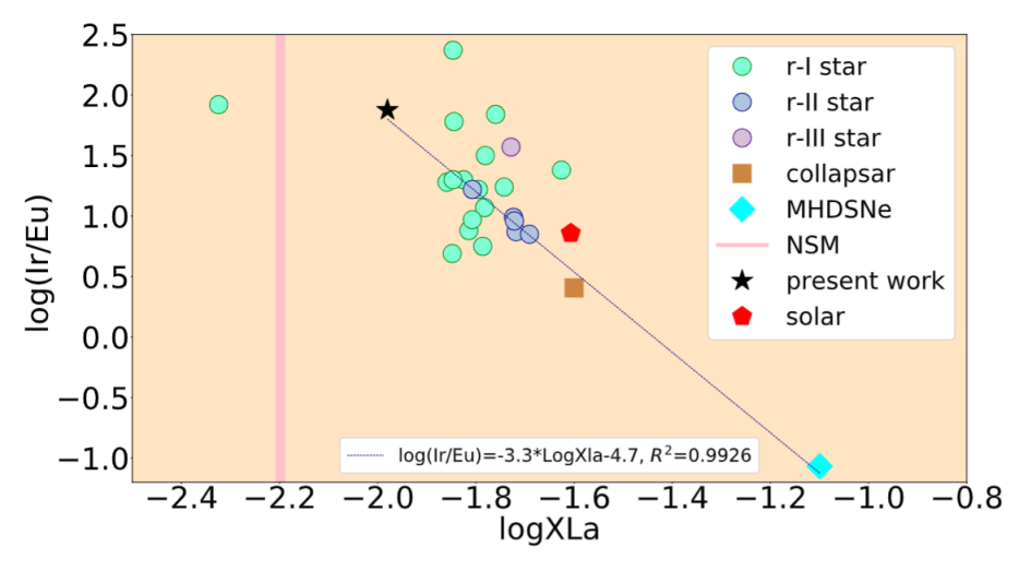 研究人員發(fā)現(xiàn)CEJSNe是目前最強的超鑭元素合成地點。在提取了被標定為r-過程增強星的天文觀測量及相關(guān)理論模型值后,研究發(fā)現(xiàn) CEJSNe與其它理論模型呈現(xiàn)出很好的反關(guān)聯(lián)關(guān)系。這表明,豐富的稀土元素和超鑭元素不能同時出現(xiàn)在同一次r-過程核合成中。研究同時指出,如果沒有CEJSNe,r-過程增強星的觀測值將很難被理論模型解釋,因此該研究進一步提升了r-過程核合成理論的完備性。