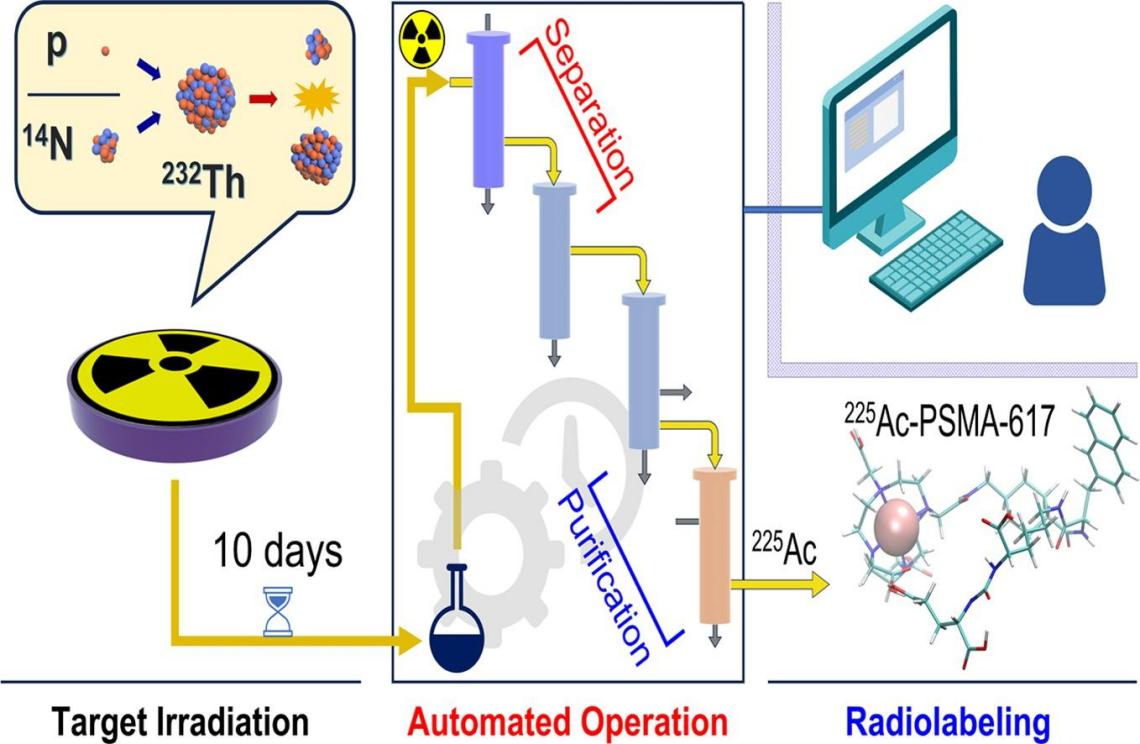 團(tuán)隊(duì)基于蘭州重離子加速器研究裝置提供的中高能質(zhì)子束和氮束,自主研發(fā)和建立了一套可同步制備鐳-223和錒-225的自動(dòng)化分離系統(tǒng),建立了完整的“釷靶輻照-分離純化-藥物標(biāo)記”的制備工藝路線(xiàn),顯著提高了鐳-223和錒-225的分離純化效率。