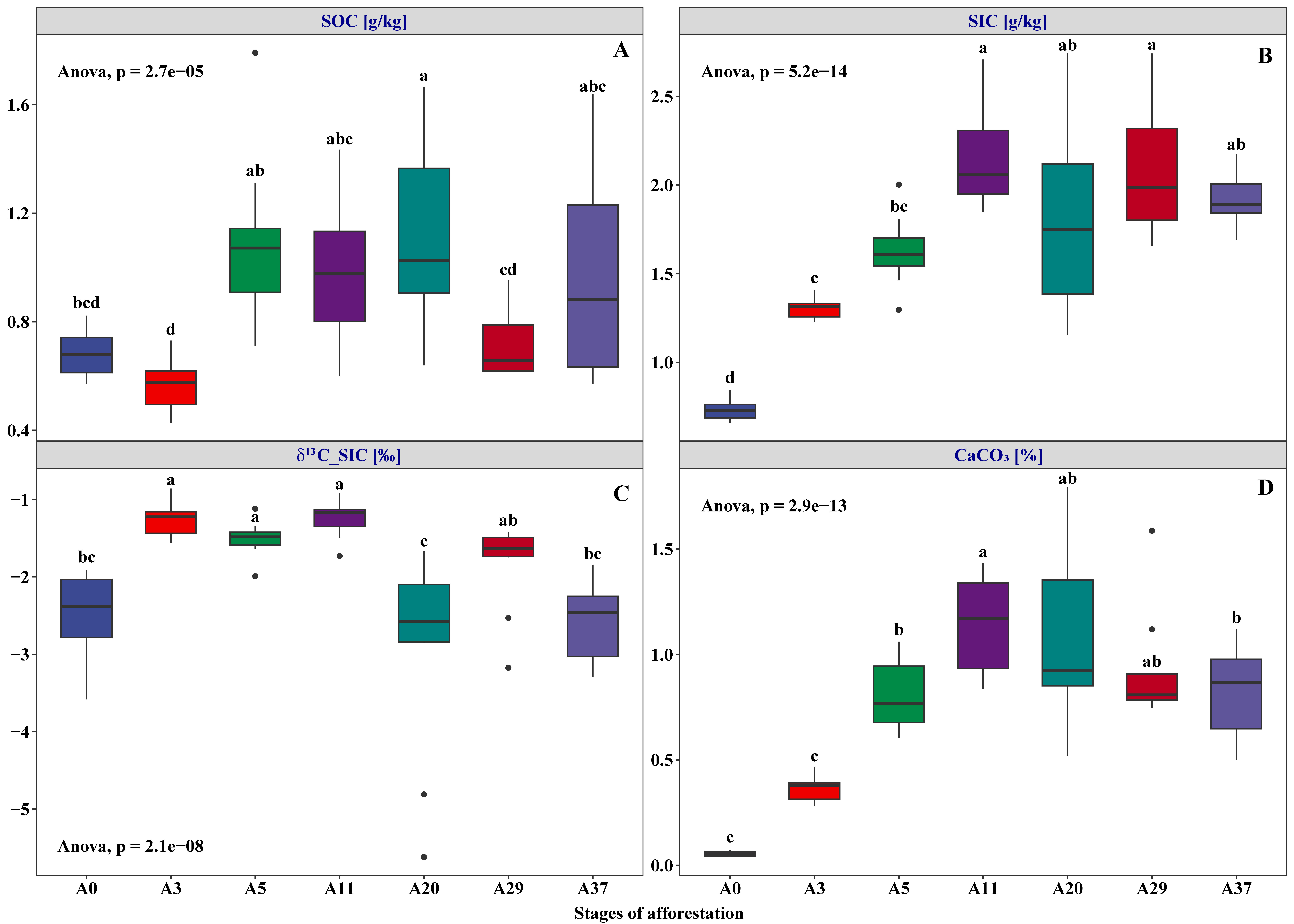 土壤有機(jī)碳(SOC)含量及變化是土壤健康評(píng)估的重要指標(biāo)。但對(duì)于以鹽堿土為主的荒漠區(qū)而言,土壤無機(jī)碳(SIC)含量及變化對(duì)生態(tài)系統(tǒng)的健康和穩(wěn)定同樣重要。以往研究表明:人工造林顯著增加了土壤SOC和SIC含量,但對(duì)SOC和SIC變化的影響因素及生物和非生物因素的理解還存在不足。因此,研究荒漠區(qū)人工固沙植被群落土壤碳含量變化及影響機(jī)理對(duì)于沙漠化防治技術(shù)提升、沙漠邊緣阻擊戰(zhàn)順利實(shí)施及我國(guó)北方防沙帶建設(shè)等具有重要意義。