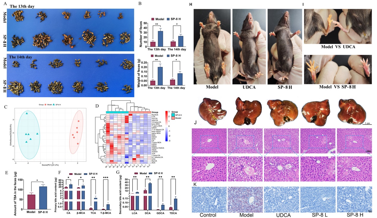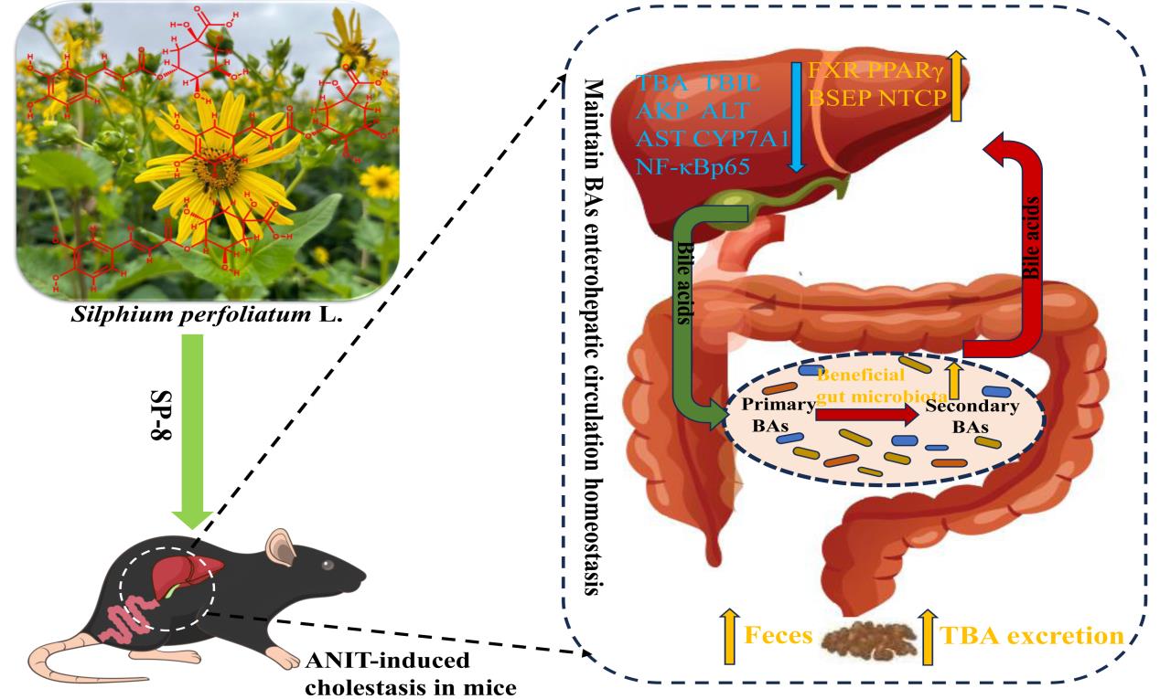 中國科學(xué)院西北高原生物研究所高原藥用資源生態(tài)保護(hù)與繁育研究團(tuán)隊(duì)從一種傳統(tǒng)藥材中篩選得到咖啡??鼘幩峄钚越M份,對(duì)CLD具有顯著的治療效果。該組份不僅能夠通過調(diào)控FXR信號(hào)通路,減少BAs的合成,而且能夠通過促進(jìn)BAs的肝腸循化,加速有害次級(jí)膽汁酸通過糞便排出體外,同時(shí)具有極強(qiáng)的抗炎活性,對(duì)膽汁淤積引起的肝臟損傷具有極強(qiáng)的保護(hù)和治療作用。該研究全面證實(shí)了咖啡??鼘幩峄钚越M份對(duì)膽汁淤積癥的治療效果并闡明了其作用機(jī)制,證實(shí)該組份具有很好的藥物開發(fā)潛力。