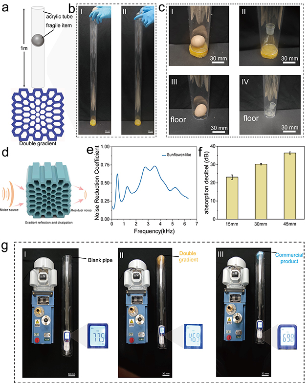 另外,受向日葵髓雙梯度結(jié)構(gòu)啟發(fā),研究人員采用光固化3D打印聚氨酯彈性體設(shè)計(jì)構(gòu)筑了具有孔徑和壁厚雙梯度變量的仿生雙梯度結(jié)構(gòu)聚氨酯。這種仿生雙梯度結(jié)構(gòu)聚氨酯具有選擇性的抗屈曲性以及各向異性的機(jī)械性能和耗散行為,有效提升了其比強(qiáng)度、能量吸收和抗撕裂性特性,解決了傳統(tǒng)多孔泡沫材料性能調(diào)控難、功能單一等問(wèn)題,在阻尼緩沖減振和消音降噪等領(lǐng)域具有很好的應(yīng)用潛景。
