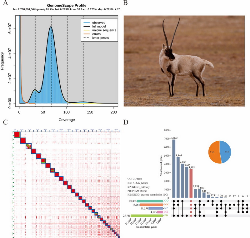 中國(guó)科學(xué)院西北高原生物研究所動(dòng)物生態(tài)與資源保護(hù)研究團(tuán)隊(duì)聯(lián)合青海大學(xué),基于PacBio HiFi三代基因組測(cè)序、Hi-C測(cè)序和DNBSEQ-T7二代基因組survey測(cè)序三種測(cè)序技術(shù),成功組裝了藏羚染色體級(jí)別的基因組。結(jié)果顯示,藏羚基因組大小為3.1 Gb,Contig N50為84.6 Mb,所有基因掛載到30條染色體上(29?。),與之前的核型研究一致。數(shù)據(jù)評(píng)估顯示,藏羚基因組BUSCO得分為98.2%(S:92.3%,D:5.9%,F(xiàn):0.8%,M:1.0%),平均QV值為70.14,表明組裝的連續(xù)性好,完整度和準(zhǔn)確性高。基于EDTA和RepeatModeler從頭預(yù)測(cè)的藏羚基因組中重復(fù)序列注釋結(jié)果表明,藏羚基因組重復(fù)序列主要由SINEs、LINEs、LTRs 和DNA transposons四種類型組成,序列總長(zhǎng)度為1.65 Gb,占基因組的52.47%;基于蛋白同源預(yù)測(cè)、蛋白從頭預(yù)測(cè)和深度學(xué)習(xí)等多種策略,在藏羚基因組上共注釋到28,330個(gè)功能基因。綜上,通過(guò)多種技術(shù)手段,首次獲得了藏羚染色體水平的高質(zhì)量基因組和注釋信息,為藏羚的適應(yīng)進(jìn)化遺傳機(jī)制、保護(hù)遺傳學(xué)研究及進(jìn)一步探索物種遷徙行為的遺傳機(jī)制提供了重要的基因組資源。