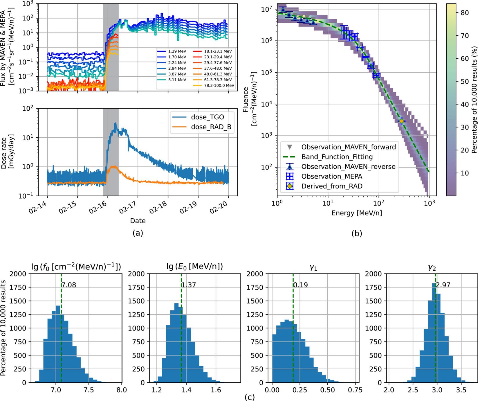 本研究使用了多個(gè)探測器數(shù)據(jù)來構(gòu)建相關(guān)質(zhì)子能譜。中低能段的質(zhì)子能譜由能量粒子分析儀和美國高能粒子儀提供。更高能段的質(zhì)子通量是團(tuán)隊(duì)結(jié)合火星表面的輻射評估探測器和火星粒子傳輸模型模擬反演得到。研究團(tuán)隊(duì)通過對上述觀測和反演的能譜進(jìn)行擬合,得到了此次太陽高能粒子事件在火星空間1~1000MeV能量范圍內(nèi)的完整質(zhì)子能譜。