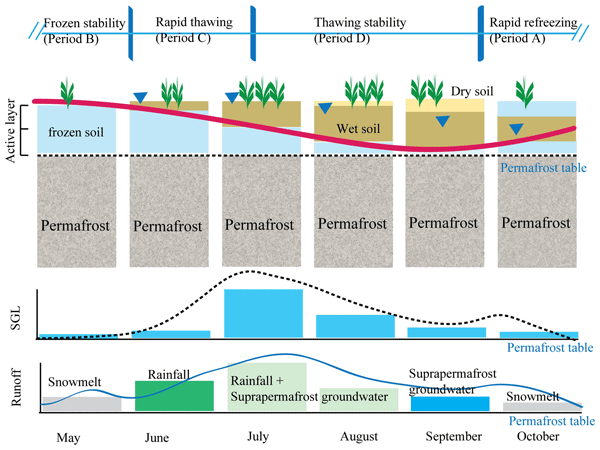 圖1. 多年凍土活動層凍融過程“土壤水-凍土層上水-地表徑流”動態(tài)的響應(yīng)理論框架