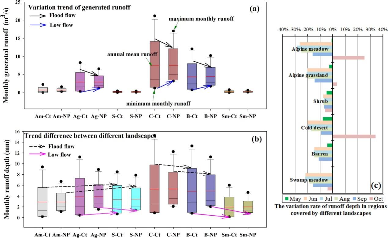 圖2.凍土退化對典型流域不同下墊面的徑流過程及水源涵養(yǎng)能力影響。橫坐標Am,Ag,S,B,C,和?Sm 分別表示高寒草甸、高寒草原、灌叢、裸地、寒漠和沼澤草甸.?Ct?和?NP?分別表示現(xiàn)狀和凍土退化情景