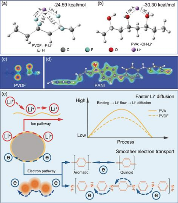 針對電化學(xué)吸附過程中電極內(nèi)Li+擴散速率和電子轉(zhuǎn)移速率不匹配,從而制約電極電化學(xué)活性的問題,設(shè)計和制備了離子和電子雙導(dǎo)聚(乙烯醇)-聚苯胺(PVA-PANI)共聚物(CP),并包覆到吸附劑顆粒表面,促進(jìn)Li+擴散和電子轉(zhuǎn)移,實現(xiàn)吸附效率的提高。HMO@CP電極具有優(yōu)越的電化學(xué)活性和吸附效率,吸附容量高達(dá)49.48 mg/g。機理研究表明,PVA中帶負(fù)電荷的羥基(-OH)可以富集Li+并加速Li+的擴散,PANI中的共軛結(jié)構(gòu)和氧化還原活性醌類位點提供了更密集的電子分布促進(jìn)電子轉(zhuǎn)移(圖1)。該工作以離子擴散和電子轉(zhuǎn)移為出發(fā)點,以提高離子擴散速率和電子轉(zhuǎn)移速率匹配度為導(dǎo)向,實現(xiàn)吸附效率的提高(ACS Nano,18 (2024) 31204-31214)。