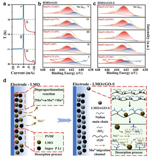 除離子傳輸效率外,針對錳基電活性材料因電極極化導(dǎo)致的穩(wěn)定性較差的問題,采用還原氧化石墨烯(rGO)與Nafion協(xié)同改性的策略制備得到高效穩(wěn)定電化學(xué)吸附材料。rGO在增加材料分散性的同時大幅降低了材料極化,緩解極化過程帶來的容量衰減,使得吸附容量和循環(huán)穩(wěn)定性得到提升。研究表明Nafion通過主鏈與還原氧化石墨烯表面羧基結(jié)合,而支鏈磺酸基團(tuán)(-SO3-)可以捕獲因歧化反應(yīng)溶出的Mn2+,從而使得材料表面局部Mn2+濃度升高(圖2)。經(jīng)過協(xié)同改性,材料30次循環(huán)容量保持率由79.04%提升至94.64%。該研究驗證了離子捕獲機制抑制歧化反應(yīng)的可行性,能夠為錳系材料在電化學(xué)分離過程中的溶損問題提供新的解決思路(Chem. Eng. J,497?。?024) 155009)。