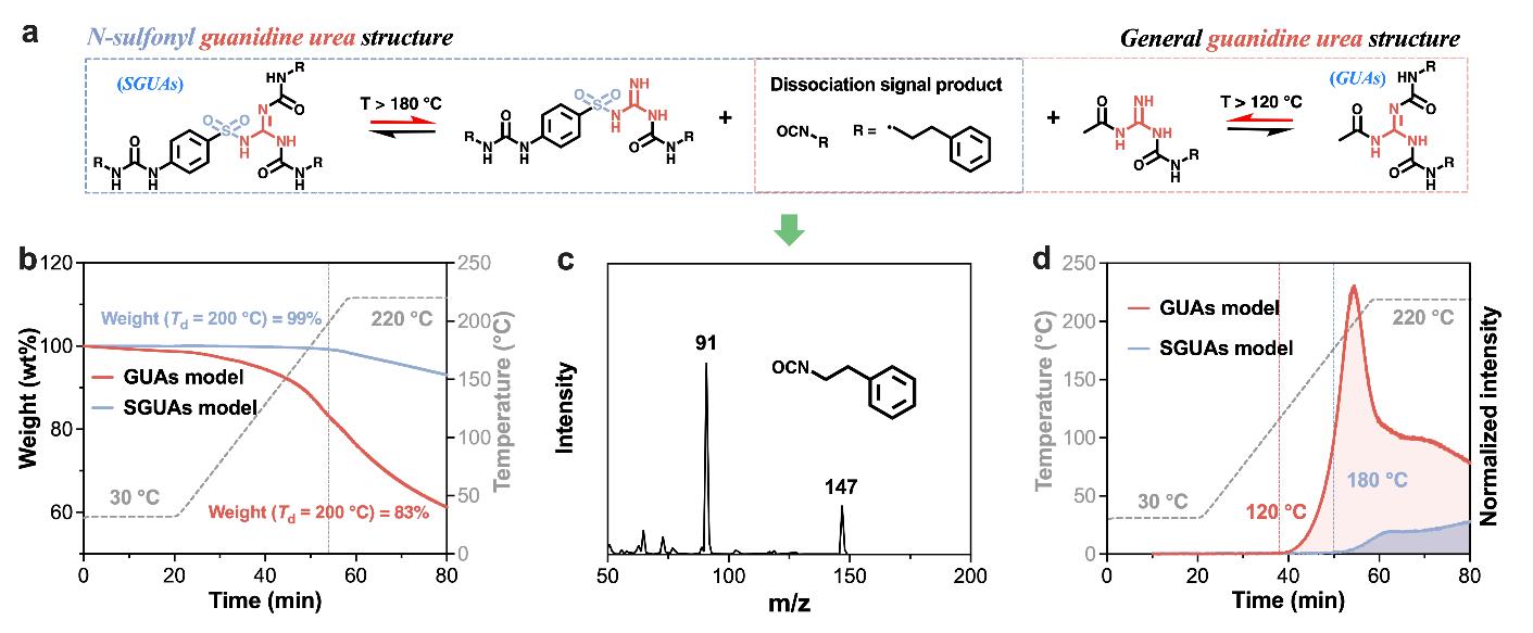 由于胍胺脲鍵具有高度的解離性,聚胍脲材料的熱穩(wěn)定性和尺寸穩(wěn)定性表現(xiàn)較差。針對這一問題,近期報(bào)道了一種N-磺?;译褰Y(jié)構(gòu)(SGUA)。相比于GUA結(jié)構(gòu),SGUA結(jié)構(gòu)在保持動態(tài)特性的同時(shí),其解離溫度得到了很大提升,從120 °C提升至180 °C(圖2)。相應(yīng)聚合物材料的熱穩(wěn)定性和尺寸穩(wěn)定性也得到了大幅提升。盡管SGUA結(jié)構(gòu)的解離溫度超過了180 °C,但這種材料在160 °C,20 MPa條件下仍能夠進(jìn)行熱壓成型。網(wǎng)絡(luò)的流變行為表明,這種網(wǎng)絡(luò)不再遵循解離型交換反應(yīng)機(jī)制,而是符合結(jié)合型網(wǎng)絡(luò)交換的特點(diǎn)。相關(guān)成果以“N-Sulfonyl Guanidine Urea to Design Ultrastrong,Stable,and Recyclable Associative Dynamic Polyurea Networks”為題,發(fā)表在Macromolecules(2024,57,23,10938–10947)。