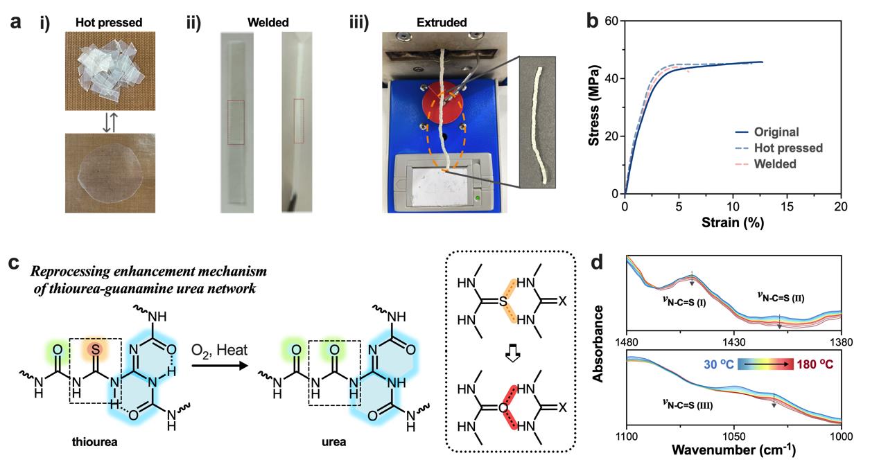 圖3. 胍硫脲雙解離網(wǎng)絡(luò)的多種加工方式以及加工前后力學(xué)性能比較