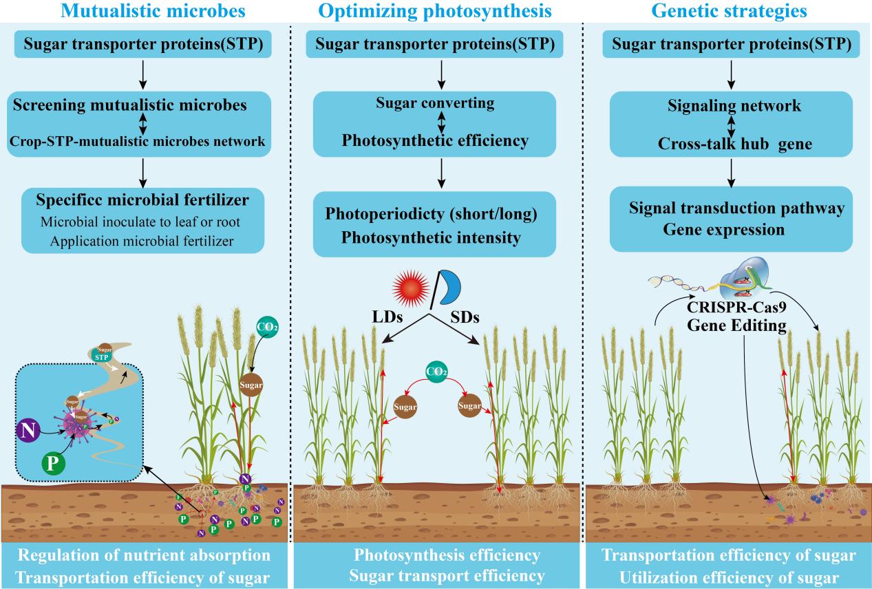圖4.?通過糖轉(zhuǎn)運(yùn)蛋白提高作物產(chǎn)量的關(guān)鍵策略