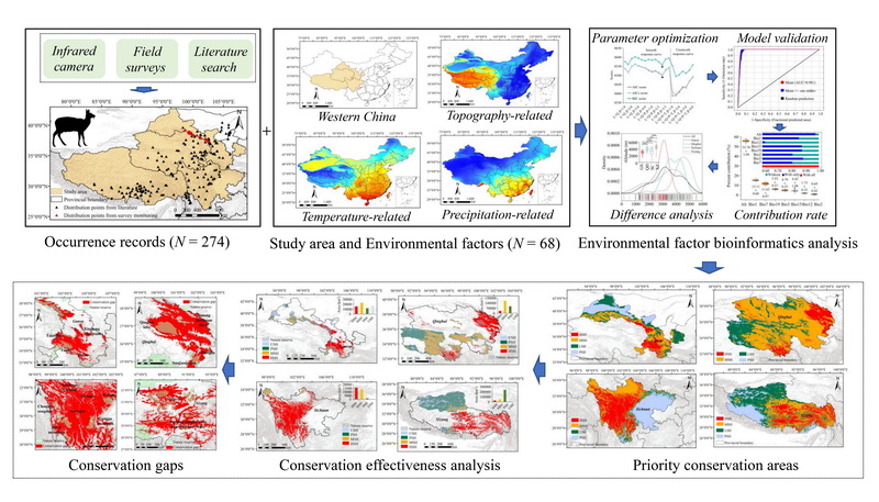 研究論文?Assessment approach for conservation effectiveness and gaps for endangered species based on habitat suitability: A case study of alpine musk deer in western China?近期發(fā)表于?Ecological Indicators(中國科學(xué)院2區(qū)TOP,IF?。健?.00)。西北高原所特別研究助理江峰為第一作者,張同作研究員為通訊作者。該工作得到了青海省自然科學(xué)基金青年項(xiàng)目(2023-ZJ-952Q)和中國博士后科學(xué)基金特別資助項(xiàng)目(2024T170992)的資助。