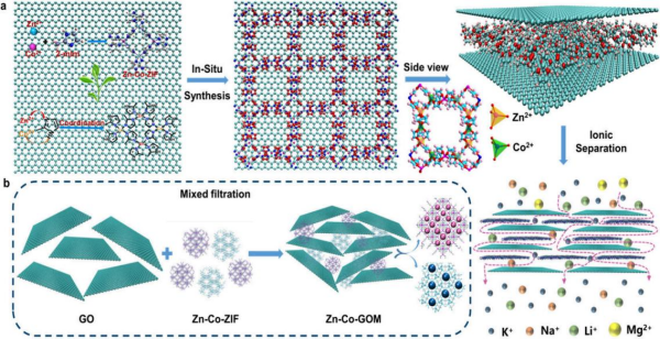 從鹽湖鹵水中獲取鋰資源是最重要的途徑之一。鹵水成分復(fù)雜,Mg2+和Li+水合離子半徑相似,鎂鋰分離難度大。膜分離技術(shù)具有節(jié)能、高效、環(huán)保、操作靈活和成本低等特點,可通過精細(xì)調(diào)控膜的孔徑和表面化學(xué)性質(zhì),實現(xiàn)對特定離子的選擇性分離。但膜的穩(wěn)定性、耐腐蝕性以及長期使用后的性能衰退仍然是制約膜分離技術(shù)應(yīng)用的主要問題。針對上述問題,青海鹽湖所鹽湖有機(jī)質(zhì)與硼鉀分離技術(shù)課題組開發(fā)了一種新型的雙金屬有機(jī)框架(MOF)/氧化石墨烯(GO)復(fù)合膜,以提高鹽湖鋰的提取效率。