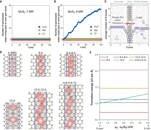 石國升研究員團隊基于前期水合離子界面相互作用的新理解,原創(chuàng)性提出離子可以精準調控二維通道尺寸,“裝訂”石墨烯膜用于離子篩分和海水淡化,此外還首次揭示自然條件下反常化學計量比晶體Na2Cl/Na3Cl/K2Cl/Li2Cl/CaCl等反晶[Sci. Rep. 3,3436(2013);?Angew. Chem. Int. Ed. 10,10190 (2014);Phys. Rev. Lett. 134,12104 (2015);Phys. Rev. Lett. 117,238102 (2016);Nature 550,380 (2017);Nat. Chem. 10,694 (2018);Natl. Sci. Rev. 8,nwaa274 (2021);J. Colloid Interface Sci. 648,102 (2023);Nano Lett. 23,10884 (2023);Nat. Water 1,800 (2023);Small 60,21,2408566 (2025);J. Hazard. Mater. 487,137078 (2025);J. Am.Chem. Soc. 147,3478 (2025);Nano Lett. 25,2334 (2025)]。基于這些前期工作對界面水合離子相互作用的理解以及對受限空間離子篩分和輸運行為的認識,進一步發(fā)現(xiàn)通過調控MoS2晶界納米孔缺陷尺寸,可以實現(xiàn)有效水/離子分離和離子精準篩分,達到海水淡化及離子精準提取的效果。