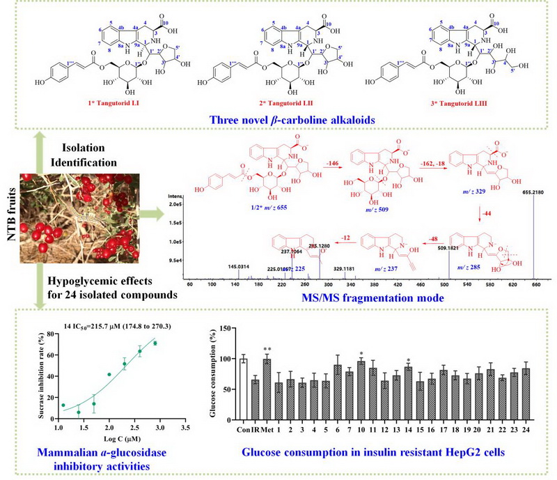 相關研究結果以?Tentative characterization of three novel coumaroyl glucoside β-carboline alkaloids and discovery of hypoglycemic compounds from Nitraria tangutorum Bobr. Fruit?為題,于3月27日在?Food Chemisty?(中國科學院1區(qū),影響因子8.5)在線發(fā)表。西北高原所岳會蘭研究員為第一作者和通訊作者。該工作得到了青海省中央引導地方項目(2025ZY008)的資助和支持。