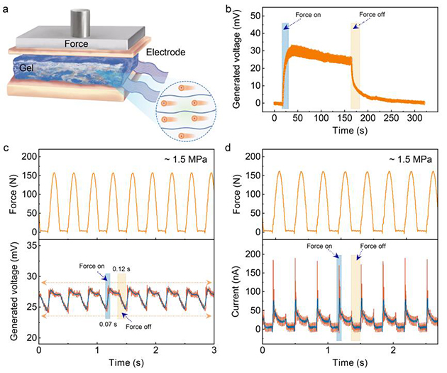 界面之間的運動、行為會耗散大量的機械能,比如界面摩擦,潤滑是減小能源消耗的有效途徑。然而,對于一些極端工況,界面的機械耗散是不可避免的,為此,針對極端環(huán)境下的高承載或高抗沖擊工程軟材料需求,超滯后介導(dǎo)的機械訓(xùn)練構(gòu)建的超強共晶凝膠可通過力電轉(zhuǎn)導(dǎo)的方式收集機械能,并將轉(zhuǎn)化的電能作為傳感信號反映壓力應(yīng)變(圖3),該研究展示了共晶凝膠在高溫環(huán)境中的力學(xué)穩(wěn)定性及作為離子壓電機械感受器在壓力驅(qū)動力電轉(zhuǎn)導(dǎo)的響應(yīng)性能,實現(xiàn)了強韌力學(xué)與電學(xué)性能之間的力?電耦合的協(xié)同設(shè)計,為性能和功能的適配耦合提供了全新的設(shè)計范式和構(gòu)建策略。