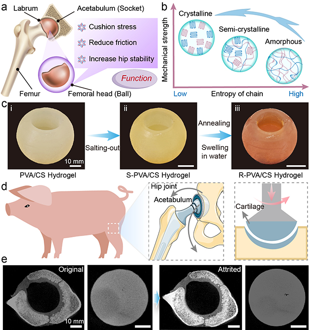近日,團隊提出了一種低熵納米晶域網(wǎng)絡(luò)調(diào)控策略,即通過調(diào)節(jié)高熵非晶態(tài)和低熵晶態(tài)結(jié)構(gòu)的比例來構(gòu)建機械魯棒性的潤滑水凝膠。研究人員通過提高聚合物網(wǎng)絡(luò)中PVA大分子鏈的百分比(相對于CS的比例)來誘導PVA鏈的結(jié)晶生長,獲得了具有低熵聚合物鏈態(tài)和高結(jié)晶度的PVA/CS水凝膠,再經(jīng)水化后獲得具有高機械強度和優(yōu)異潤滑性的水凝膠材料。調(diào)控優(yōu)化的水凝膠斷裂強度為7.7~17.5 MPa、彈性模量為8.6~10.6 MPa、韌性為8.8~62.1 MJ m-3、壓痕硬度為10.4~21.7 MPa,同時該水凝膠的摩擦系數(shù)可低至0.026,且具有很好的潤滑持久性,實現(xiàn)了水凝膠在機械強度和潤滑性能的雙重提升,解決了傳統(tǒng)水凝膠在高負載條件下易破裂或變形問題。此外,研究還展示了PVA/CS水凝膠在模擬人體承重組織中優(yōu)異的耐磨性,特別是在人工髖關(guān)節(jié)中的應(yīng)用,為高性能人工關(guān)節(jié)潤滑材料的研發(fā)提供了新思路。