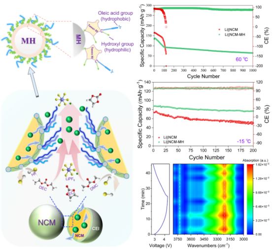 研究團(tuán)隊(duì)首先以Tween80為框架物質(zhì)構(gòu)建一種弱交聯(lián)柔性受限空間,電沉積獲得所需超細(xì)納米氫氧化鎂載體(D50=15 nm),并通過Tween80原位改性實(shí)現(xiàn)納米氫氧化鎂功能化。用所得材料對(duì)鋰電池三元正極材料(LiNi0.5Co0.2Mn0.3O2)進(jìn)行表面修飾,并進(jìn)行電池組裝和性能測(cè)試。原位紅外分析表明,Li?與 Tween80 分子間存在持續(xù)的配位和解離過程,使Tween80 分子荷電狀態(tài)發(fā)生動(dòng)態(tài)變化,并在電場(chǎng)作用下發(fā)生連續(xù)的構(gòu)型轉(zhuǎn)變,亦即“烷基鏈搖曳”行為。烷基鏈搖曳使得納米氫氧化鎂在電池循環(huán)伊始就參與反應(yīng),快速形成薄而致密的富鎂無機(jī)正極固態(tài)電解質(zhì)界面膜。這種膜熱穩(wěn)定性高、耐腐蝕性強(qiáng),能夠有效抵御高溫電解液攻擊。而在低溫環(huán)境下,電解液通常會(huì)在正極表面積聚,并常因流動(dòng)性差而阻礙鋰離子傳輸。此時(shí)烷基鏈搖曳可顯著促進(jìn)電解液的界面流動(dòng),兼之富鎂界面層具有優(yōu)異離子導(dǎo)電性,使鋰離子低溫傳輸變得非常順暢。研究結(jié)果表明,通過“烷基鏈搖曳”界面驅(qū)動(dòng)設(shè)計(jì),鋰離子電池可在60℃穩(wěn)定充放電1000圈以上,同時(shí)保持70 mAh/g容量和90%以上庫(kù)侖效率。在-5℃和-15℃分別循環(huán)500圈、200圈后,容量仍能保持在80 mAh/g以上。該研究在配備熱管控系統(tǒng)后,電池實(shí)際寬溫域性能有望進(jìn)一步提升。
